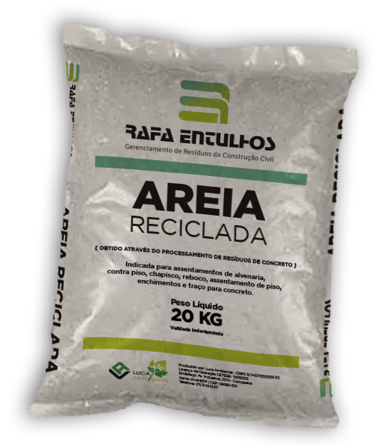 A areia reciclada é obtida através do beneficiamento e processamento de resíduos de concreto. É possível ser utilizada em assentamento de bloco, reboco, chapisco, contra-piso, etc. O resíduo classe A é processado, beneficiado e transformado em agregado reciclado. A usina possui tecnologia avançada para processar o agregado e assim produzir a areia de excelente qualidade de acordo com a norma ABNT NBR 15116.