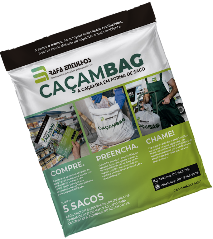 Caçambag são sacos tipo bags, confeccionados a partir de materiais resistentes contra possíveis rasgos ou danificações indevidas. Eles são destinados a coleta de entulhos, plásticos e etc. Produto destinado para facilitar a coleta de pequenas quantidades de resíduos gerados em uma obra. Fácil de utilizar e também fácil para descartar.